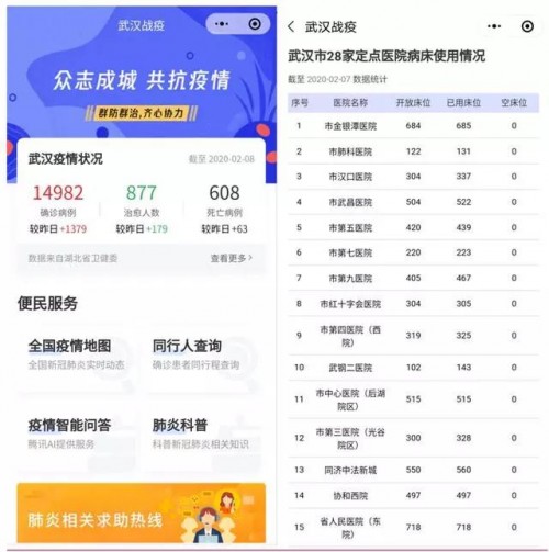 武漢也上線了"武漢戰(zhàn)疫"小程序,可以查詢武漢疫情狀況,以及疫情辟謠、發(fā)熱自查、發(fā)熱門診導航等,同時還能查詢武漢各大醫(yī)院的床位,方便感染者快速住院。