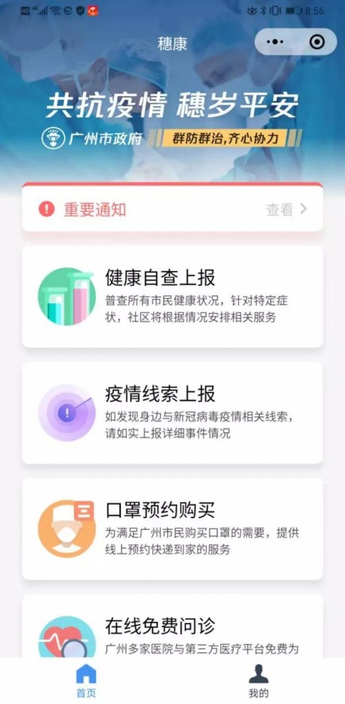 廣州市政府上線了"穗康"小程序,支持重要通知發(fā)布、健康自查上報、疫情線索上報、口罩預約購買、在線免費問診等幾個模塊。