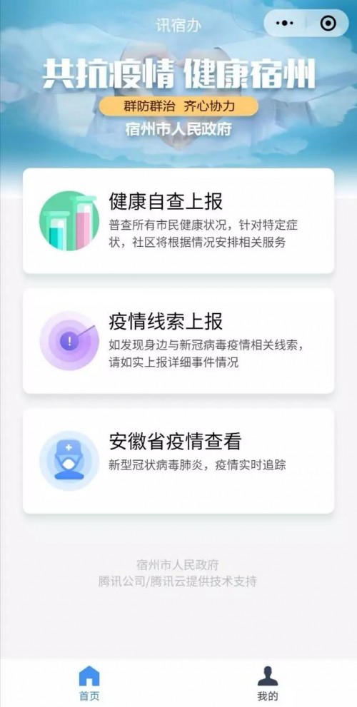 不僅僅這些地級市上線"防疫"微信小程序,一些小城也快速行動起來。安徽省宿州市的"皖事通·迅宿辦"也上線了,支持查看疫情、線索上報和健康自查上報。